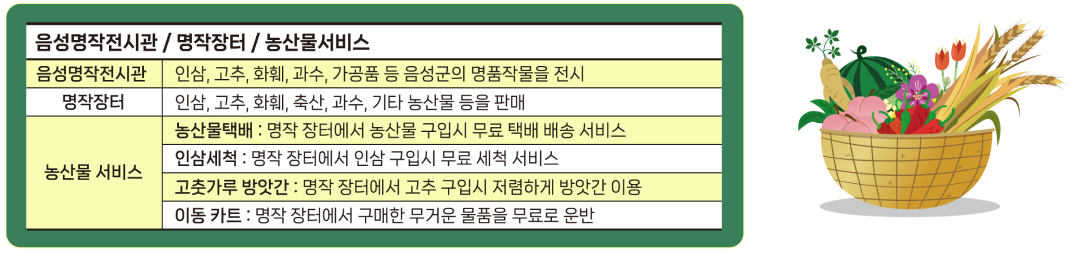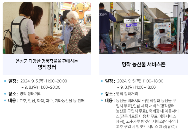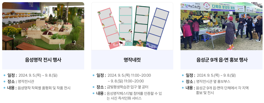음성군에서 생산하는 모든 명품 농축산물을 선보이는 축제입니다. 농산물 문화 마케팅 축제, 음성의 이야기를 담아내는 축제, 가을의 풍성함을 꼭 닮은 축제! 살거리 볼거리 먹거리 즐길거리가 함께하는 내실있는 축제를 기대해주세요!