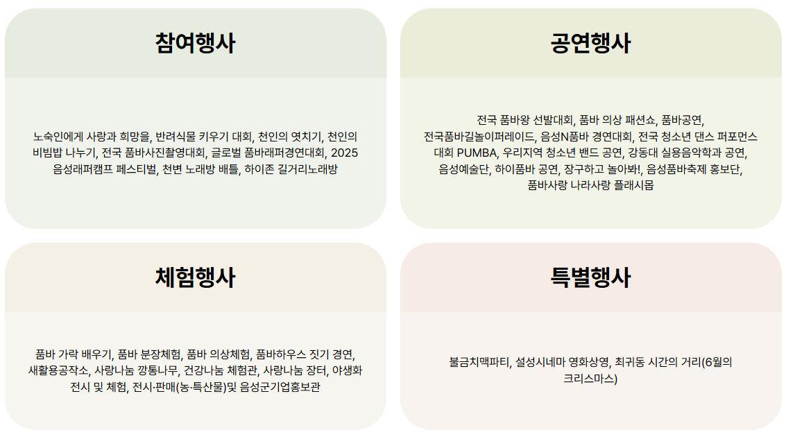 음성품바축제는 메인 프로그램, 부대 프로그램, 체험 프로그램으로 나뉘어 다채로운 즐길 거리를 제공해요. 2024년 축제의 성공을 바탕으로 2025년에는 더욱 풍성한 볼거리가 준비되어 있답니다. 주요 프로그램을 하나씩 살펴볼게요