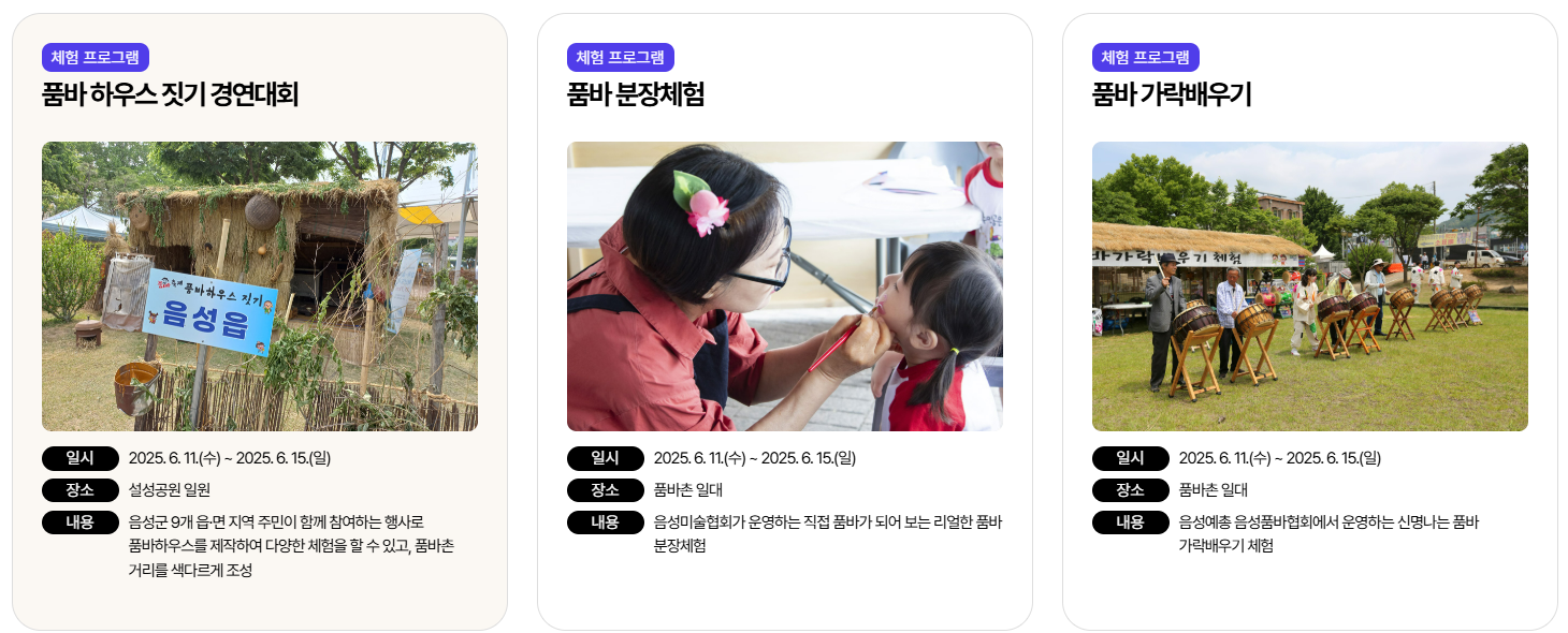 - 음성N품바 경연대회: 축제 마지막 날(6월 15일), 15개 팀이 새로운 품바 스타일을 선보이며 피날레를 장식해요.