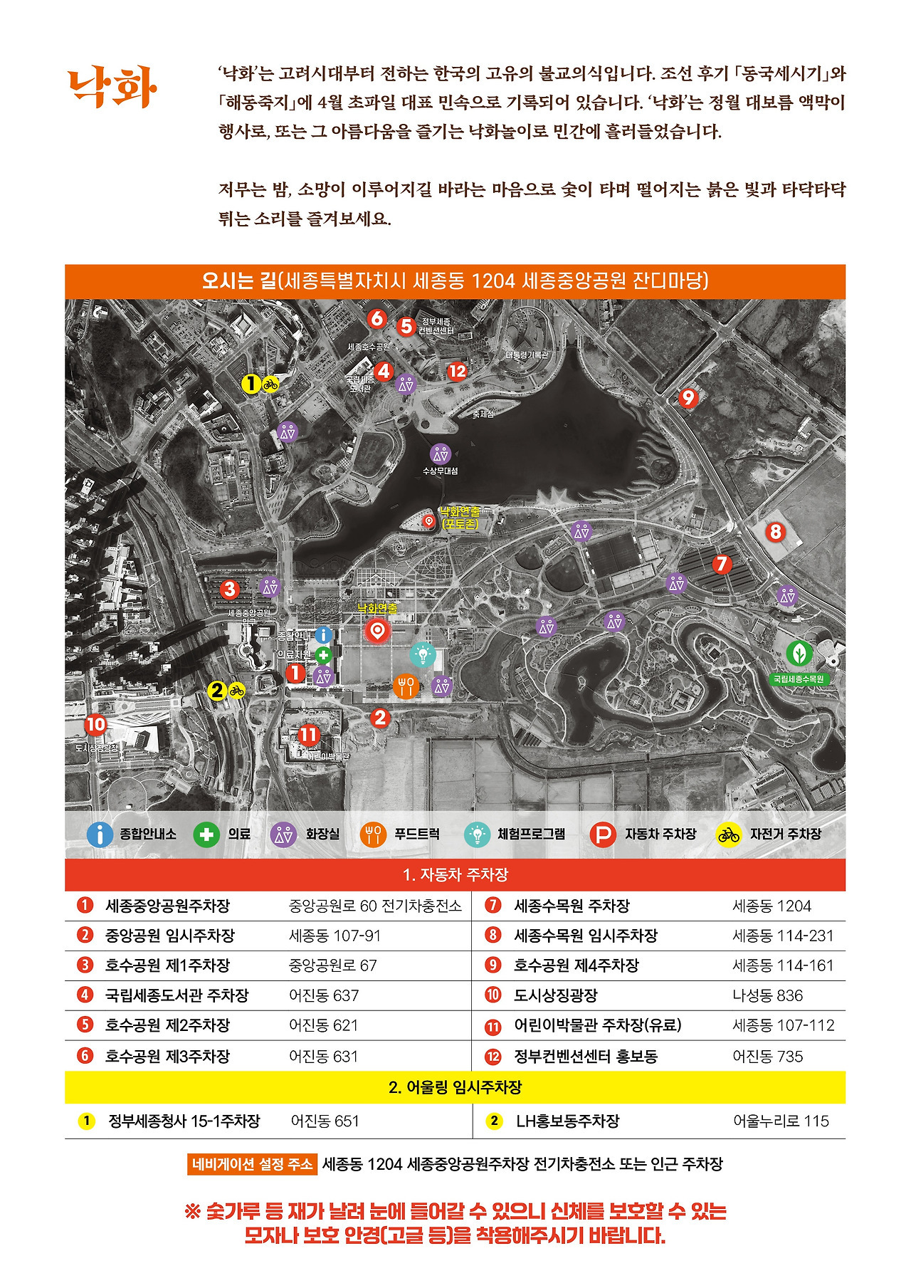 축제는 단 하루 동안 진행되지만, 짧은 시간 안에 다채로운 프로그램과 화려한 낙화 퍼포먼스가 펼쳐져 방문객들에게 깊은 인상을 남깁니다. 특히, 세종호수공원의 아름다운 야경과 어우러진 낙화는 사진 찍기에도 최적의 장소입니다.